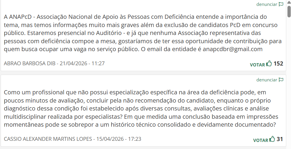 Para o parlamentar, o objetivo da Audiência “é avaliar os critérios técnicos e a transparência das avaliações biopsicossociais realizadas por concursos públicos; e a legalidade das exclusões na etapa de enquadramento como pessoa com deficiência. Os convidados também devem discutir a efetividade das políticas de reserva de vagas para pessoas com deficiência em concursos para carreiras de segurança pública e atividades de natureza operacional”.