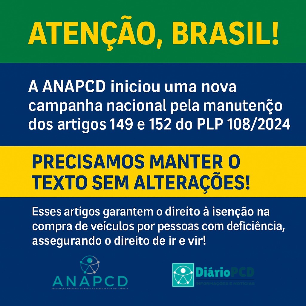 A ANAPcD iniciou uma nova campanha nacional pela manutenção dos artigos 149 e 152 do PLP 108/2024, já aprovados no Senado Federal. Esses artigos garantem o direito à isenção na compra de veículos por pessoas com deficiência, assegurando o direito de ir e vir!
