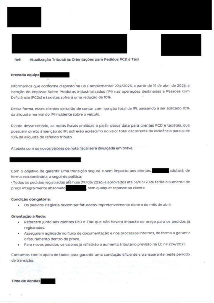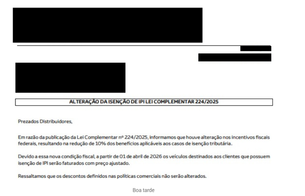 Uma das montadoras, informou aos distribuidores que “em razão da publicação da Lei Complementar n 224/2025, informamos que houve alteração nos incentivos fiscais federais, resultando na redução de 10% dos benefícios aplicáveis aos casos de isenção tributária”. Conforme imagem abaixo, a montadora ainda afirma que “devido a essa nova condição fiscal, a partir de 1 de abril de 2026 os veículos destinados aos clientes que possuem isenção de IPI serão faturados com preço ajustado”.