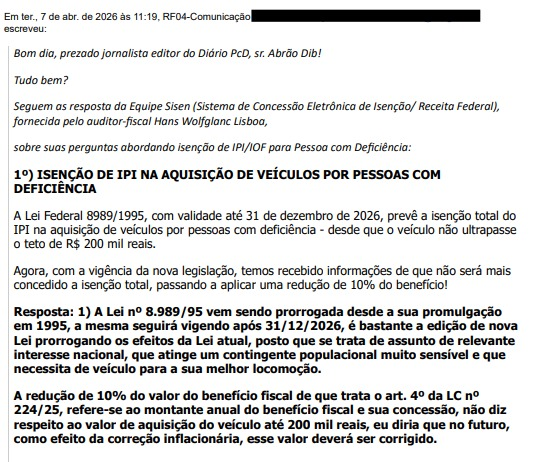 A Seção de Comunicação Institucional – Sacin, da Superintendência Regional da Receita Federal do Brasil – 4ª Região Fiscal, em nota oficial, após consultar o Auditor-Fiscal Hans Wolfglanc Lisboa, afirmou que “a Lei nº 8.989/95 vem sendo prorrogada desde a sua promulgação em 1995. A mesma seguirá vigendo após 31/12/2026, é bastante a edição de nova Lei prorrogando os efeitos da Lei atual, posto que se trata de assunto de relevante interesse nacional, que atinge um contingente populacional muito sensível e que necessita de veículo para a sua melhor locomoção. A redução de 10% do valor do benefício fiscal de que trata o art. 4º da LC nº 224/25, refere-se ao montante anual do benefício fiscal e sua concessão, não diz respeito ao valor de aquisição do veículo até 200 mil reais, eu diria que no futuro, como efeito da correção inflacionária, esse valor deverá ser corrigido”.