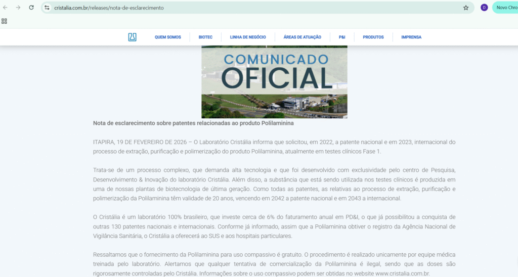 “O Laboratório Cristália informa que solicitou, em 2022, a patente nacional e em 2023, internacional do processo de extração, purificação e polimerização do produto Polilaminina, atualmente em testes clínicos Fase 1. Trata-se de um processo complexo, que demanda alta tecnologia e que foi desenvolvido com exclusividade pelo centro de Pesquisa, Desenvolvimento & Inovação do laboratório Cristália. Além disso, a substância que está sendo utilizada nos testes clínicos é produzida em uma de nossas plantas de biotecnologia de última geração. Como todas as patentes, as relativas ao processo de extração, purificação e polimerização da Polilaminina têm validade de 20 anos, vencendo em 2042 a patente nacional e em 2043 a internacional”.