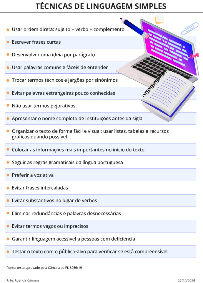 A nova lei lista 18 técnicas de linguagem que devem ser usadas pelos órgãos públicos na comunicação com o cidadão. Entre elas: