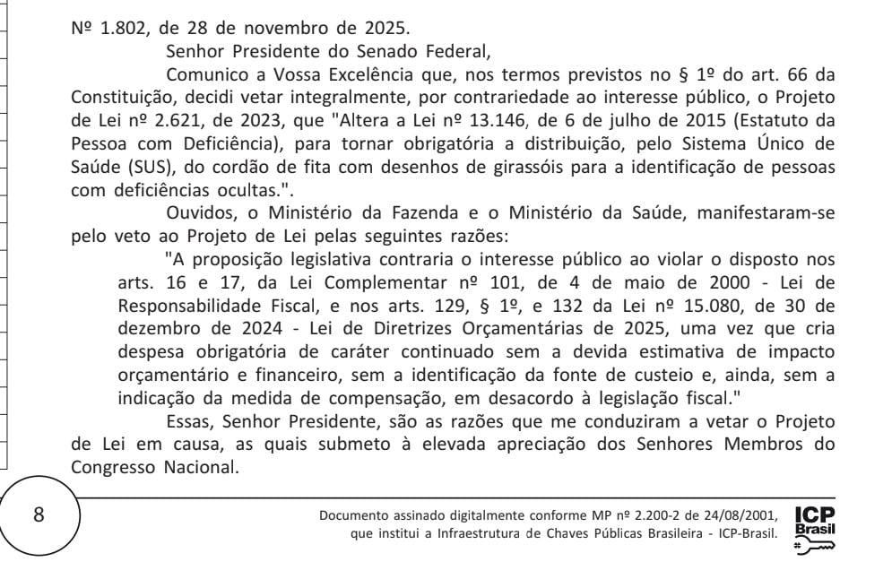 Vetada distribuição de cordão para identificação de doença oculta. Projeto de Lei 2621/2023 havia sido aprovado pelo Senado Federal e previa que o Sistema Único de Saúde (SUS) deveria distribuir cordões com desenhos de girassóis para identificar pessoas com deficiências ocultas