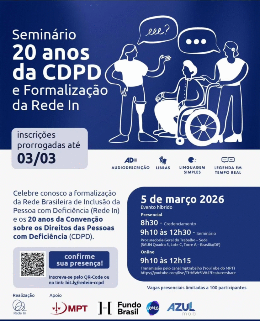 Card com fundo azul e o título em destaque “Seminário 20 anos da CDPD e Formalização da Rede In”. À direita, ilustração de três pessoas conversando: uma pessoa em cadeira de rodas, outra com prótese na perna e uma terceira com aparelho auditivo. Abaixo do título aparecem os ícones de acessibilidade: audiodescrição, Libras, linguagem simples e legenda em tempo real. Informações do evento: 5 de março de 2026. Evento híbrido. Presencial: 8h30 Credenciamento. 9h10 às 12h30 Seminário. Local: Procuradoria-Geral do Trabalho – Sede, SAUN Quadra 5, Lote C, Torre A, Brasília/DF. Online: 9h10 às 12h15, transmissão pelo canal mptrabalho no YouTube do MPT. No lado inferior esquerdo, texto convidando para celebrar a formalização da Rede Brasileira de Inclusão da Pessoa com Deficiência e os 20 anos da Convenção sobre os Direitos das Pessoas com Deficiência. Há um QR Code com a indicação “Inscreva-se aqui”. No rodapé, logos da Rede In como realização, do MPT e do Fundo Brasil como apoio. Indicação de vagas presenciais limitadas a 100 participantes e confirmação até 03 de março.