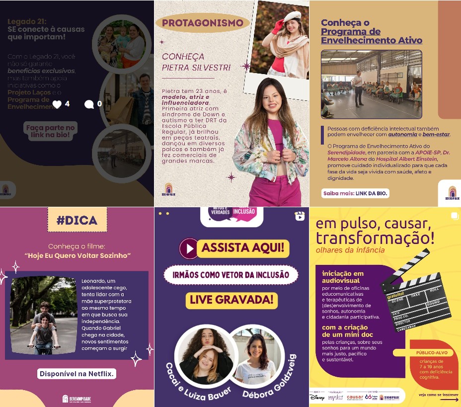 O Instituto Serendipidade é uma organização sem fins lucrativos que potencializa a inclusão de pessoas com deficiência, com propósito de transformar a sociedade através da inclusão. Visa ser impulsor de impacto social relevante, colaborativo e inovador, sempre prezando pela representatividade, protagonismo, de forma transversal e acima de tudo, com muito respeito. As iniciativas que atendem diretamente o público são: Programa de Iniciação Esportiva para crianças com síndrome de Down e deficiência intelectual, de famílias de baixa renda; Programa de Envelhecimento que atende mais de 60 idosos com algum tipo de deficiência intelectual para promoção do bem-estar; e o Projeto Laços, que acolhe famílias que recebem a notícia de que seu filho (a) tem algum tipo de deficiência. Atualmente, o Serendipidade impacta mais de um milhão de pessoas, criando pontes, gerando valor em prol da inclusão e através do atendimento direto a pessoas com deficiência intelectual e suas famílias.