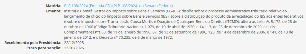 A urgência em sancionar o PLP 108 é crítica porque o período-teste de cobrança dos novos impostos (IBS e CBS) começa em 2026.